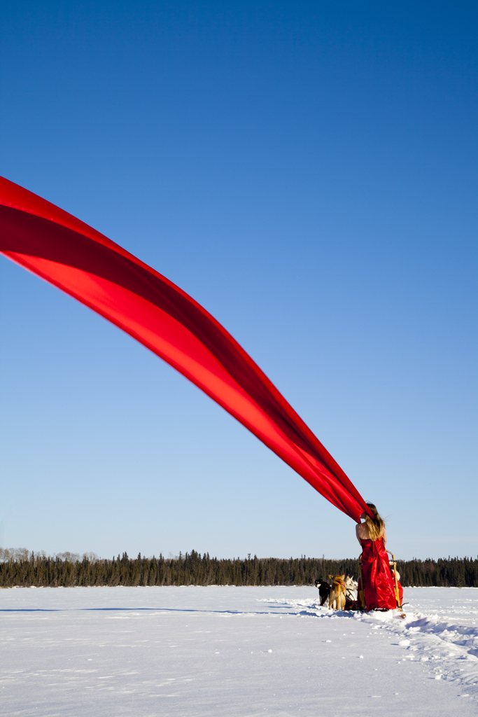 In Northern Saskatchewan Landscape with Dogs (after Pieter Bruegel the Elder) Velkova explores the ‘spirit of the north.’ The photograph’s subtitle references the genre painting of Flemish artist Pieter Bruegel, known for his portrayal of sweeping landscapes and country peasants at play. The parallel between Velkova’s photograph and Bruegel’s painting is illustrated by the vivid winterscape, where Velkova rides a dogsled through the prairie beneath an endless blue sky, trailed by a long, flowing red cape. Dogsledding, also known as Mushing, is a traditional form of transportation in Northern Saskatchewan, and remains a contemporary tourist attraction often advertised as a ‘unique winter adventure.’