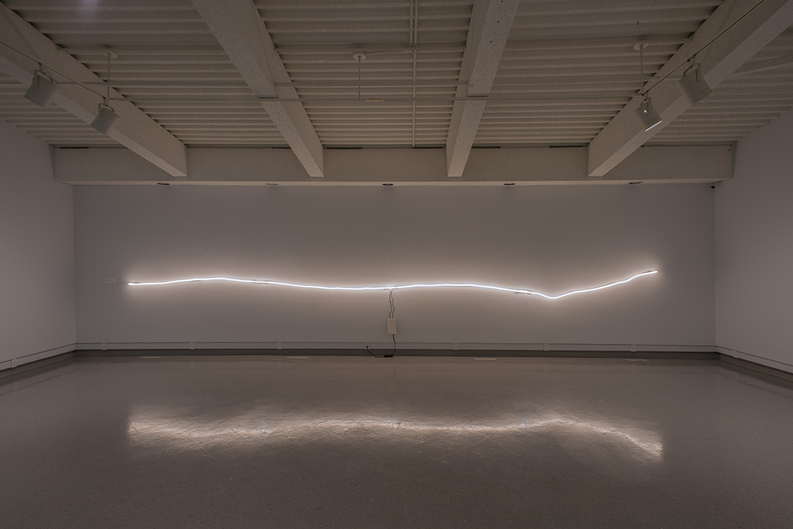 The minimalist aesthetic of Untitled Saskatchewan Landscape symbolizes the low horizon lines found in the badlands of southern Saskatchewan. The installation of the light tube plays with the architecture of the gallery space, drawing a distinct horizontal line with minor undulations across the gallery wall.