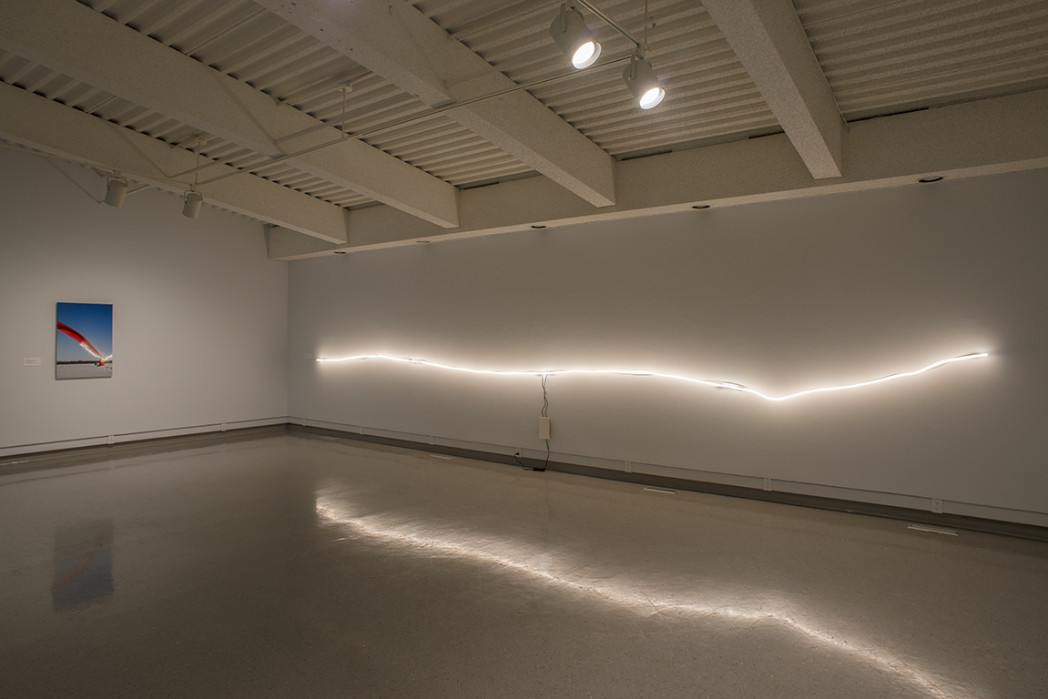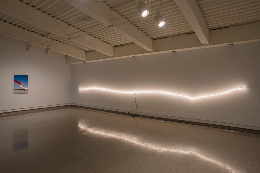 The minimalist aesthetic of Untitled Saskatchewan Landscape symbolizes the low horizon lines found in the badlands of southern Saskatchewan. The installation of the light tube plays with the architecture of the gallery space, drawing a distinct horizontal line with minor undulations across the gallery wall.